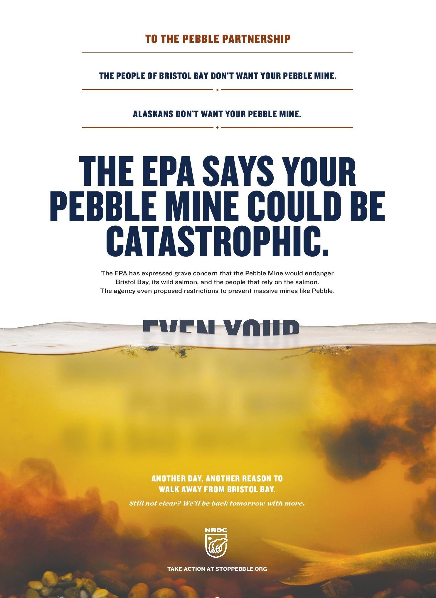 Bristol Bay is home to the world's greatest wild salmon fishery, supplying half of the world's sockeye salmon. Salmon support a $1.5 billion annual commercial fishery that employs 14,000 full and part-time workers. Salmon are not only the economic backbone of the region, but also the lifeblood of Bristol Bay's native communities that have relied on subsistence fishing for millennia. Yet the Pebble Partnership wants to build a giant gold and copper mine at the headwaters of these important salmon runs. The Pebble Mine would produce up to 10 billion tons of mining waste and would destroy 94 miles of streams and 5,350 acres of wetlands, ponds, and lakes - key habitat for salmon. The mine's open pit would be almost as deep as the Grand Canyon, and the mine's total footprint would cover an area larger than Manhattan - all located in a seismically active area. As if the environmental footprint alone isn't reason enough to stop the Pebble Mine, here are a few other reasons highlighted in the ads.