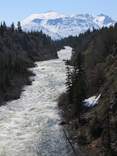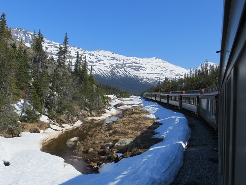 Then on August 16, 1896, American prospector George Carmack, his indigenous Tagish brother-in-law Shookum Jim Keish and his nephew Kaa Goox, better known as Dawson Charlie, found gold in Rabbit Creek, a tributary of the Klondike River. It was quickly rechristened Bonanza Creek. Skagway, sea gateway for Klondike gold rush On July 15, 1897, a ship with prospectors and their bonanza tied up in San Francisco. Two days later a second vessel did likewise in Seattle. Almost literally within minutes, newspapers were slavering up banner headlines blaring 'Gold! Gold! Gold!' They put the combined worth at $1.14 million, more than $1 billion in today's dollars. Thus was spawned one of the largest peacetime migrations ever, the Klondike gold rush, launching over 100,000 hopefuls on the long journey north. What the hopeful saw at end of sea journey Some 30,000 to 40,000 completed the 500 mountainous overland miles from Skagway, the gateway from the sea at the top of a fjord in Alaska's panhandle. Fjord view from Skagway The entrepreneurial spirit ruling supreme, within two years a railway was driven and blasted up the 113 miles over the 2,865-foot White Pass to Whitehorse, now Yukon's capital, from where prospectors could more easily reach the gold fields further north at Dawson City by boat on lake, river - and rapids. But by then, too, the Klondike gold rush was lagging, despite the greater ease afforded by the White Pass and Yukon Route Railroad (WP&YR), whose main contractor, Michael Heney, famously said: 'Give me enough dynamite and snoose (apparently finely powdered tobacco), and I'll build a railroad to hell.' Railway start in Skagway WP&YR had already been preempted by the latest screaming newspaper headlines of a new bonanza, this time in Nome, far to the west on Alaska's coast. An early engine Today Skagway, an indigenous word meaning 'home of the north wind,' nestles in its fjord bower surrounded by glacier-capped crags, drawing a tourist bonanza from its glorious past as huge cruise ships deposit hundreds of thousands of visitors each year to the Klondike Gold Rush National Historical Park. They're more than willing to fork out gold for dross, dollars for kitschy souvenirs. Cruise ships tie up in Skagway Close-up If anything truly merits the visitors' attention, though, it is the WP&YR, which now runs several trips a day in season in restored vintage carriages the 20 miles or so over White Pass to Fraser in British Columbia, Canada, and then on a further 45 miles or so to Bennett Lake or Carcross, whence a bus will continue to Whitehorse. WP&YR on its ride to White Pass The scenery is truly spectacular as the narrow-gauge choo-choo (actually it's diesel) climbs up the twisting ravine of the Skagway River beneath jagged snowy peaks Matterhorn-ing skywards in brilliant sunshine, our fourth straight cruise day of magnificent mid-May weather that is so uncharacteristic for the Alaska panhandle. More views from the train Waterfalls, large and small, tumble down the cliffs every few yards - and, alas, a zillion selfies click every few nano-inches on the observation platforms with a gazillion inane and insane grimaces, grins and grunts. I must be in a proud minority of one in my aversion to the selfie craze. Yet more views Below the snow and glaciers, the landscape of temperate rainforest is incredibly lush with wall-to-wall carpets of deep green spruce covering the steep slopes and plunging river valleys. As we climb higher towards the flag bedecked rock marking the U.S.-Canadian border, the landscape changes. It's now much more rugged, the sparse vegetation and dwarf trees few and far between. Approaching the Canadian border The border Close-up Descending from the border But once we descend slightly we enter the boreal forest, not as lush or lofty as on the other side of the mountains, but equally beautiful in its own way. The Canadian side Intermediate halt Lake Tutshi (pronounced too shy) reflects the glaciers, snow-streaked crags and towering peaks in its mirror surface of totally stilled water. And a zillion more selfies explode, totally unstilled, at the Yukon sign board. A pedestrian suspension bridge built in 2005 crosses the deep gorge of the Tutshi River as it thunders past in swirling eddies that garner it category 4 and 5 white water rafting ratings. A whole bowl of craggy mountain peaks surrounds a green plateau, snow descending half way down their sides to a carpet of boreal forest and sub-alpine tundra. Tutshi River gorge Downstream Suspension bridge Swaying over Road over canyon Back in Skagway, for all the crassness - and the four huge cruise-cities in port today - the neat little town of 800 certainly has its charms with restored wooden houses and boardwalks as it waits to fleece its prey. Skagway town There's the Skagway Bazaar art colony, the Red Onion Saloon, once one of the town's finest brothels built in 1897, the golden-domed Golden North Hotel and the Skagway Gold Rush with baubles of gold. Golden North Hotel Then there's the Eagles Hall with theatrical representations of the Naughty Nineties, and a floozie with black boa and frilly white top at half-mast mincing away outside to lure in yet more prey. Eagles Hall The hall consists of two gold rush-era hotels that were moved to the site and fit together. The Mondamin Hotel, where arch-conman Jefferson "Soapy" Smith used to live, was moved in 1916. In 1920 the Pacific Hotel was added onto the rear. Skagway main drag Soapy got his name from a caper way back in Denver where he conned people, with the aid of shills, to buy wrapped bars of soap on the pretense that there were dollar bills inside, including $100 bills. Anyway he met his comeuppance at 9.15 p.m. on July 8, 1898, here in Skagway in the Shootout on Juneau Wharf after some three-card monte caper went awry. His final words 'My God, don't shoot!' apparently came too late, but you can visit his grave. Skagway view Any gold? So, as you can see, there's a good time to 