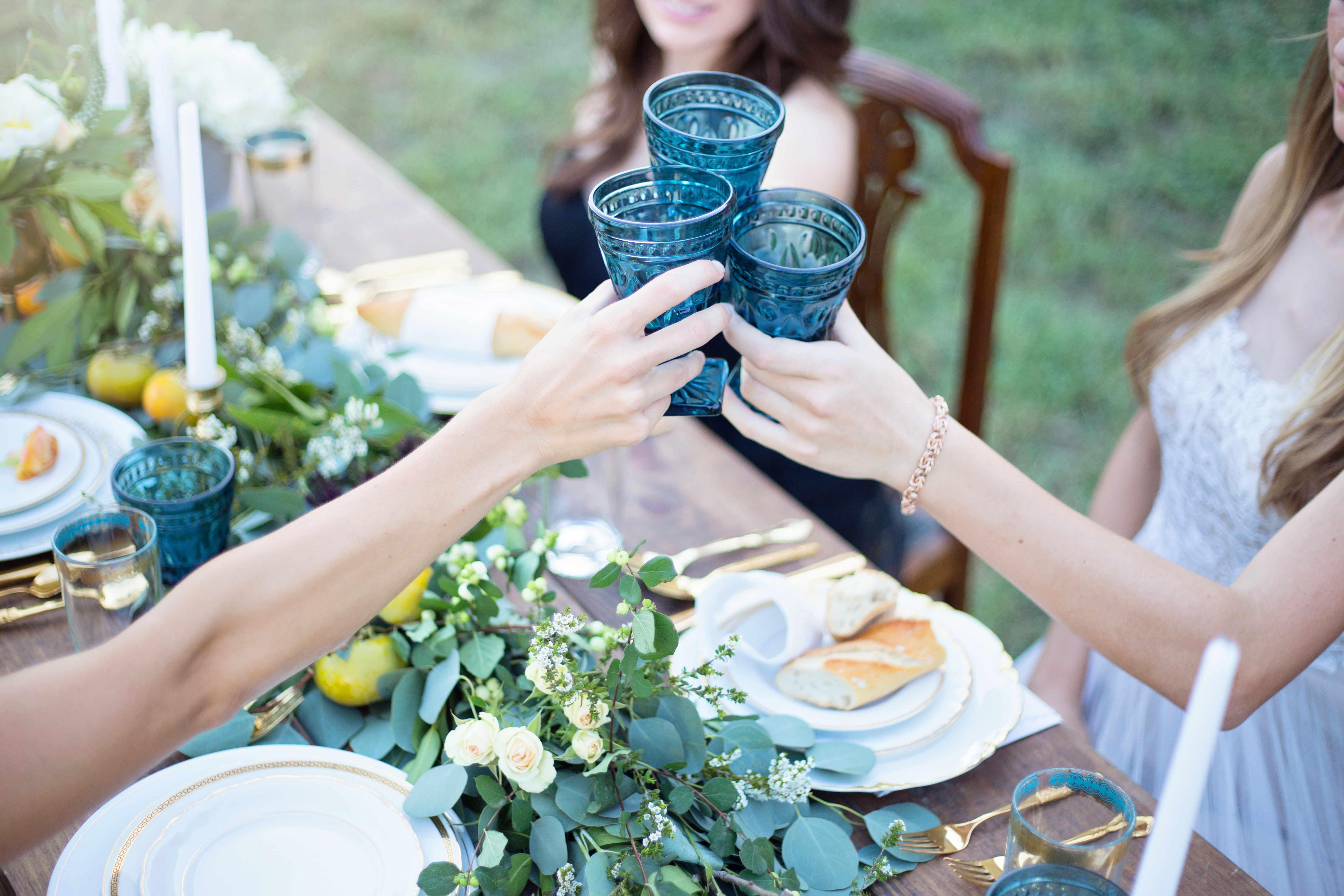 2. Pick a range of colors, and don't be afraid to make bold choices -- Often times we feel like we have to choose a max of three colors to make something work well together. Vintage is all about mismatched perfection! Pair a few unlikely colors like gold, black, green, and blue as seen here, and as long as you stay within a "family" of undertones (in this case, cool and forest-like undertones), you can rest assured the outcome will be beautiful.