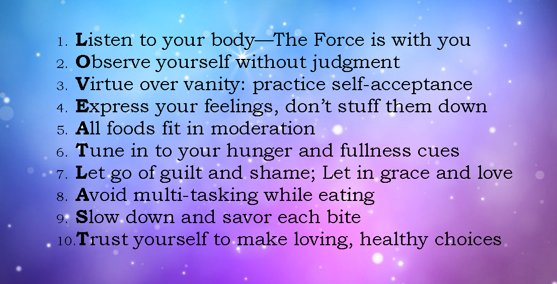 I know it can feel like extremes are the only solution. You might be thinking, "Moderation just doesn't cut it." Or, "Trust me, I'd live a healthy lifestyle if I could, but I can't!" Well, I hear you. I used to feel the same way. I felt out of control around food. I could not be trusted in front of brownies, pizza, ice cream or nachos. Diets were the only solution. Every time I felt like I had hit "rock bottom" I would be newly determined to start another diet. I would always start out strong, but by day two or three of the juice cleanse I'd be binging on junk food. The cycle of restriction and rebellion just repeated itself over and over. A few times I lasted several weeks on a diet and lost some weight, but I always inevitably gained it back. It drove me crazy! Why did it have to be such a battle?! I was a victim of the Darth Vader Dieting Mentality. If I wasn't harsh, strict and cutthroat with myself around food, I was convinced I would gain weight. Strict diets and beating myself up were the only way. Like Darth Vader, who never has mercy for anyone who fails a mission, I would beat myself up for not following through with my latest diet or kill myself on the treadmill to repent for what I'd eaten. I would always feel like a failure. No matter how hard I tried, and no matter what I did, I always came up short or gained the weight back. My dark, self-defeating thoughts were like an army of Stormtroopers invading my mind. These thoughts consumed me. What should I eat? What can I have? What can't I have? How many points is it worth? How many calories are in this? I had lost connection with my body. I was so preoccupied with rules and restrictions; I didn't even know when I was hungry or full. It was no way to live and no way to be, but I didn't know any other way. I continued with the yo-yo dieting self-torture cycle for years until one glorious day the Force was awakened within me. I found out about a program called "Am I Hungry?" by Dr. Michelle May and read her book called "Eat What You Love, Love What You Eat." She totally understood the struggle and discussed "mindful eating" (aka intuitive eating) principles in detail. My interest and curiosity were piqued. I was a little skeptical that this would work, but I was at the end of my rope. I decided to sign up for her online coaching course. The next 16 weeks completely changed my life. This course was nothing short of true Jedi training. Now, if you're still in the Darth Vader Dieting Mentality, you might think that being a Jedi means being perfect, or being super healthy all the time. No, not at all. Being a Jedi is all about trusting yourself, trusting your inner wisdom, your inner knowing and your inner good. The Force is strong within you. You can trust yourself. Jedis have a completely different approach to fighting than Darth Vader and his stormtroopers. I needed this paradigm shift to deliver me from the Dark Side. It took several months for it all to sink in, but in the end I came out a new woman with a new mind. I pledged never to diet or restrict myself again and I've never looked back. I learned to trust my gut and honor my hunger and fullness. I naturally stopped overeating -- something I thought would never change. Without exerting crazy amounts of inner will power, it became effortless to put down the ice cream or my fork. I stopped trying to lose weight, and focused on self-acceptance. After all, Yoda says, "Do or do not. There is no try." The more I focused on self-acceptance and tuning into my body's needs, the healthier I became. Spiritual psychology says, "How you relate to the issue is the issue." It was never about the food, it was about how I was relating to food and myself. "A growing body of research suggests that how you feel about your weight can influence your physical and psychological health much more than the actual number on the scale," said Harriet Brown, author of "Body of Truth." Numbers on the scale aside, it's much healthier to be in a place of self-acceptance than a constant fight inside. Love is the most powerful force, right? When we are relating to ourselves from a place of love instead of hate or fear, we find motivation to take good care of ourselves from the inside out. I am now living in freedom with food. I have a loving, trusting relationship with my body and self. There's no more fighting as food is my friend, not my enemy. Furthermore, I have much more mental space and energy to spend on other areas of my life because I'm not thinking about food all of the time. I am definitely happier and healthier as a Jedi. Here's a crash course on the Jedi approach to healthy eating. It spells out "LOVE AT LAST." It's not the easiest list to remember so feel free to copy and paste these tips into a note on your smart phone to reference back to. So be encouraged, young Jedi! This is great news! You can find a healthy size for your unique body without ever "trying" to lose a single pound. You never have to go on an extreme diet again and you can stay healthy! We can all rejoice in knowing that the light is truly more powerful than darkness. We don't have to live in pain and suffering of the Dark Side anymore. We can live in freedom and joy and make peace with our plates! My prayer for everyone in 2016 is to find peace within and a healthy way of living that lasts. The Force is already with you. You just need to be one with your force. To learn more or coach with Mandy Muenzer to become a Jedi Mindful Eating Warrior, email her at mpoweredbylove@gmail.com or visit her website, www.mpoweredbylove.org ![]() More... |